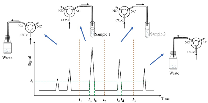 時(shí)間+閾值組合(更精準(zhǔn)): 例如,設(shè)定在t1-t2時(shí)間段內(nèi)收集“樣品1”,但只有當(dāng)此時(shí)間段內(nèi)信號(hào)強(qiáng)度也同時(shí)達(dá)到閾值s時(shí),才真正啟動(dòng)收集閥切換到收集狀態(tài)(NC口連通),否則視為無(wú)效或廢液(NO口連通)。這有效避免了收集到非目標(biāo)或低濃度餾分,提高了目標(biāo)物的純度和回收率。