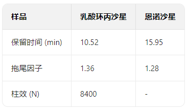 恩諾沙星保留時間 15.85min,拖尾因子 1.26,柱效(N)達 8500,分離效果與重復性優(yōu)異。