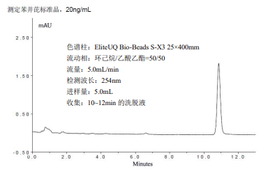 按照樣品凈化色譜條件,先取 20.0ng/mL 的校準(zhǔn)品 5.0mL,按照樣品凈化條件進(jìn)樣,根據(jù)標(biāo)準(zhǔn)品出峰時(shí)間,確定樣品餾分收集時(shí)間(一般收集標(biāo)準(zhǔn)品色譜峰起點(diǎn)時(shí)間 - 0.2min 到落點(diǎn)時(shí)間 + 0.2min 之間的餾分)。