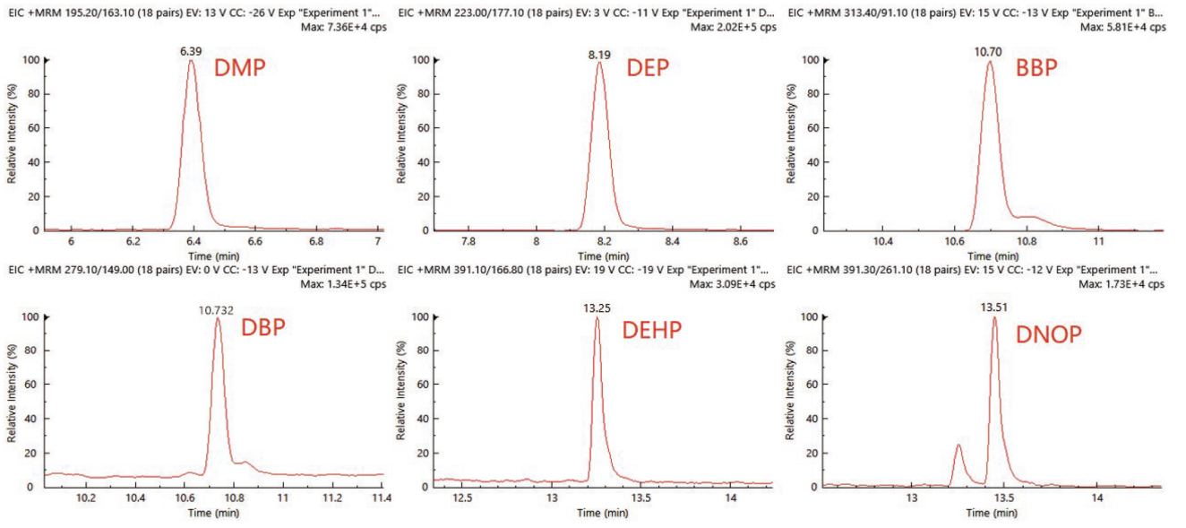 (圖 2 6 種鄰苯二甲酸酯類化合物及其內(nèi)標(biāo)的提取離子色譜圖(濃度為 100μg/L):包含 DMP、DEP、BBP、DBP、DEHP、DNOP 及其對應(yīng)內(nèi)標(biāo) DMP-d4、DEP-d4、BBP-d4、DBP-d4、DEHP-d4、DNOP-d4 的色譜圖,橫坐標(biāo)為時間(min),縱坐標(biāo)為響應(yīng)值相關(guān)參數(shù),圖中標(biāo)注了各化合物及內(nèi)標(biāo)的出峰時間,如 DMP 約 6.39min、DEP 約 8.19min、BBP 約 10.70min、DBP 約 10.732min、DEHP 約 13.25min、DNOP 約 13.51min 等,內(nèi)標(biāo)出峰時間與對應(yīng)化合物相近)