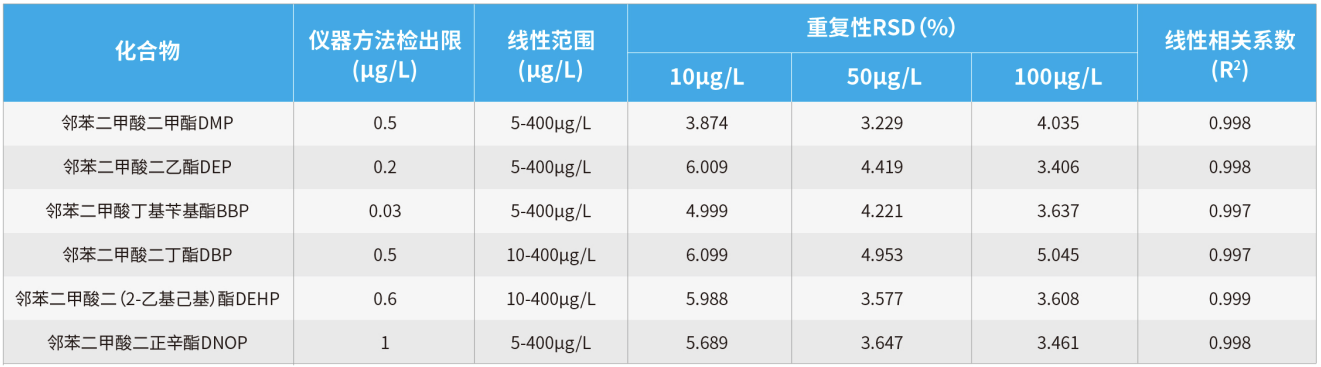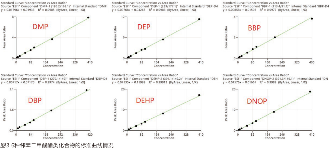 本文采用 EClassical 3200L-MS Vertical 9100 三重四極桿液質(zhì)聯(lián)用系統(tǒng)建立了快速、高靈敏度和可靠的 LC-MS/MS 實驗方法測定水質(zhì)中 6 種鄰苯二甲酸酯類化合物的含量。本方法具有分析速度快、靈敏度高、準(zhǔn)確度好等特點,且檢出限低于 HJ 1242-2022《水質(zhì) 6 種鄰苯二甲酸酯類化合物的測定 液相色譜 - 三重四極桿質(zhì)譜法》標(biāo)準(zhǔn)中限量的要求,同時數(shù)據(jù)顯示,其重復(fù)性和線性均較好,為后期高通量的樣品測定提供可靠的保障。
