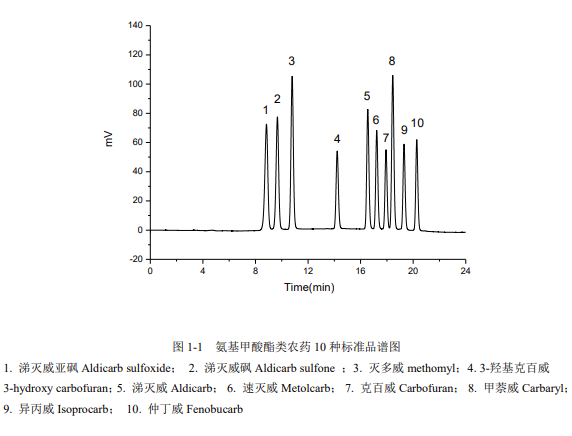 (橫坐標(biāo)為時(shí)間 min,縱坐標(biāo)為信號(hào) mV;標(biāo)注 10 種農(nóng)藥峰:1. 涕滅威亞砜、2. 涕滅威砜、3. 滅多威、4.3 - 羥基克百威、5. 涕滅威、6. 速滅威、7. 克百威、8. 甲萘威、9. 異丙威、10. 仲丁威)