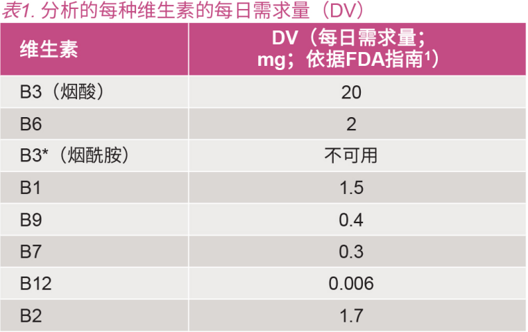 由于美國食品藥品監(jiān)督管理局 (FDA) 制定了這些維生素的每日營養(yǎng)推薦值,因此食品和補(bǔ)充劑生產(chǎn)商以及獨(dú)立檢測(cè)實(shí)驗(yàn)室需要能夠定量鑒定該類產(chǎn)品中的維生素含量。在進(jìn)行強(qiáng)化食品分析時(shí),由于維生素濃度范圍較廣,與每日容許攝取量保持一致尤其具有挑戰(zhàn)性 (見表 1)。例如,在嬰兒牛奶中,維生素 B12 (氰鈷維生素) 的濃度為 1-2ppb,而維生素 B2 (核黃素) 的濃度則高達(dá) 1000 倍 (1-2 pm)。因此,任何定量分析方法都必須能夠適應(yīng)這種廣泛的濃度分布。