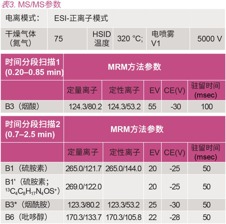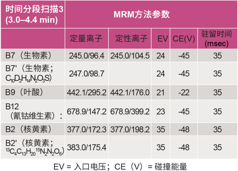 為了校準(zhǔn)和定量,使用了三個(gè)內(nèi)標(biāo):維生素 B1"(硫胺素;?13C4?C8?H17? N4?OS+)、B7"(生物素;?C10?D2?H14? N2?O3? S) 和 B2'(核黃素;?13C4?C13?H2015? N2? N2?O6?)),全部來自 Sigma-Aldrich Inc.。校準(zhǔn) B3、B3*、B6 和 B1 時(shí)采用 B1',校準(zhǔn) B7、B9 和 B12 時(shí)采用 B7,校準(zhǔn) B2 時(shí)采用 B2。?