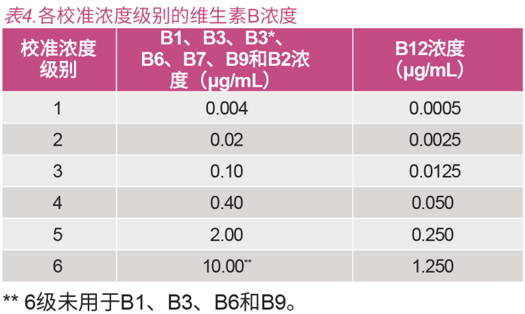 直接使用稀釋劑制備 40ug/mL 的 B3、B3*、B6 和 B1 儲(chǔ)備標(biāo)準(zhǔn)品和 5pg/mL 的 B12 儲(chǔ)備標(biāo)準(zhǔn)品。?