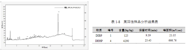 由表 1-8 知:檢測(cè)樣品中含鄰苯二甲酸二異丁酯 (DIBP) 125mg/kg,鄰苯二甲酸二 - 2 - 乙基己酯 (DEHP) 4290mg/kg,鄰苯二甲酸丁芐酯 (BBP) 和鄰苯二甲酸二丁酯 (DBP) 未檢出。