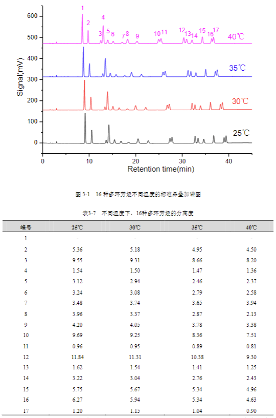 進樣分析濃度為 5μg/mL 的 16 種多環(huán)芳烴和 2μg/mL 十氟聯(lián)苯工作液,使用 3.3 中的色譜條件,實驗溫度分別為 25℃、30℃、35℃、40℃,結(jié)果如下圖所示: