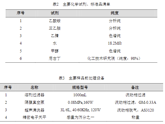 實驗過程中其它玻璃器皿還包括容量瓶 (100mL、50mL、25mL、10mL)、移液槍 (0~1000μL,0~5000μL)、移液槍槍頭 (1mL,5mL)、一次性 PVC 手套、一次性口罩、進樣針、樣品瓶、濾膜等若干。