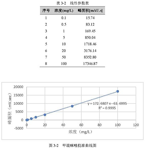 參照 GB/T 40894-2021 標(biāo)準(zhǔn)中方法,配制甲巰咪唑的標(biāo)準(zhǔn)溶液,質(zhì)量濃度為 0.1 mg/L、0.5 mg/L、1 mg/L、5 mg/L、10 mg/L、20 mg/L、50 mg/L 和 100 mg/L 的八個(gè)標(biāo)點(diǎn),計(jì)算相關(guān)線(xiàn)性系數(shù)。