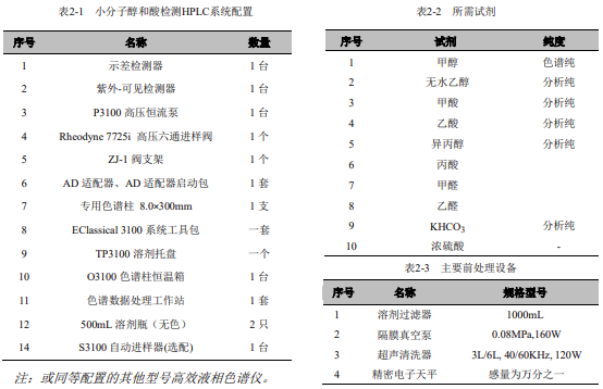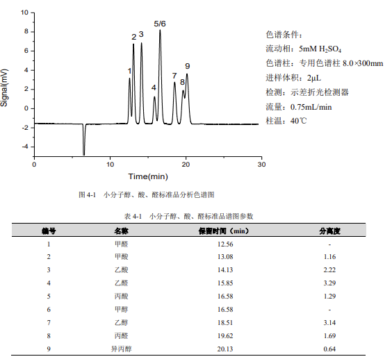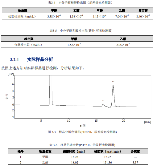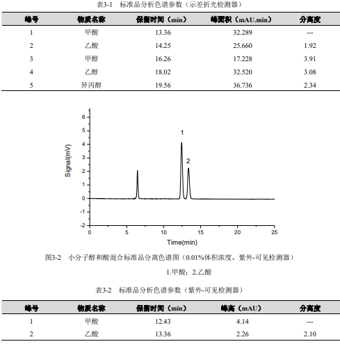 儀器設(shè)備與試劑示差折光檢測器為通用型檢測器,可以對所有小分子醇和酸進(jìn)行檢測,但其靈敏度較低,不能用于痕量檢測;紫外可見檢測器對絕大多數(shù)在紫外-可見光的波長范圍內(nèi)有特征吸收的物質(zhì)均有較高的檢測靈敏度;兩種檢測器的串聯(lián)使用,取長補(bǔ)短,即能實(shí)現(xiàn)總量分析,又能完成對甲酸、乙酸等具有代表性的物質(zhì)進(jìn)行痕量分析的需求。
