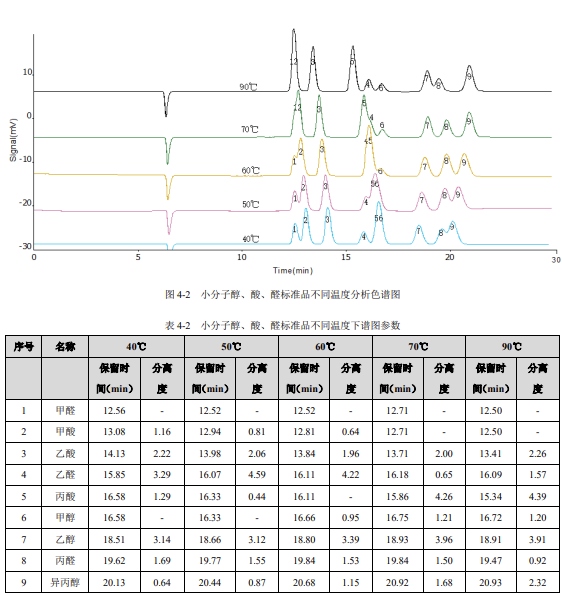 由以上結(jié)果可知,小分子醇、酸、醛的分離情況隨著溫度改變而改變,用戶可以根據(jù)自身檢測需求,選擇特定溫度進(jìn)行實(shí)驗(yàn),從而達(dá)到測定某種或者某幾種小分子醇、酸、醛含量的目的。