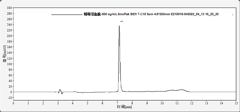 蜂毒溶血肽是一種由26個(gè)氨基酸組成的多肽,呈堿性,易溶于水,是一種人類所知的抗炎性強(qiáng)的物質(zhì)之一。依利特參考GB/T 40486-2021,采用新推出SinoPak BEH T-C18 5 μm色譜柱對(duì)蜂毒干粉中蜂毒溶血肽進(jìn)行分析檢測,所得數(shù)據(jù)可供客戶參考使用。